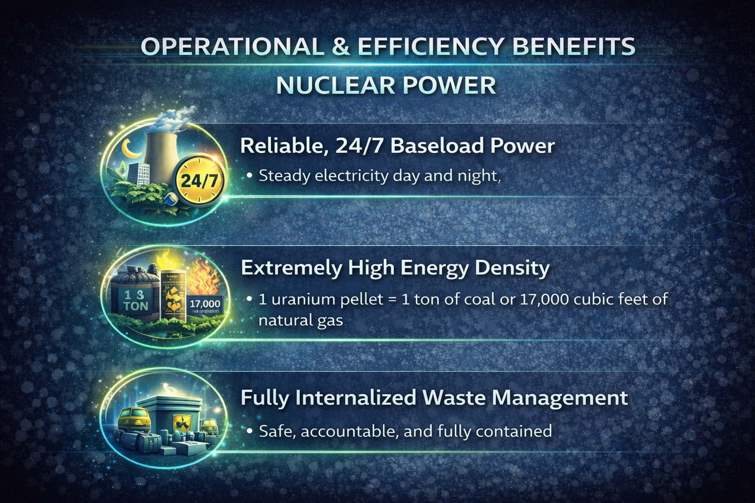 Modern societies require electricity that is available at all times. Nuclear plants operate continuously, independent of weather or seasonal variation, making them uniquely suited to provide baseload power. Hospitals, transportation networks, data centers, and industrial systems all depend on this reliability.